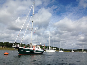 Een volgend hoogtepunt van de vakantie was het bekijken van de start van de Fastnet race. Bij Fort Victoria (het nauwste stukje van de Solent) zagen we alle boten van de Fastnet voorbij razen. Zowel de 140 voet trimaran van Abu Dhabi, de Volvo Open 70´s als de achteraan liggende klassiekers. Met daartussenin alle andere helden in de verschillende klassen. Een heerlijke dag! Daags erna vertrokken we uit Yarmouth om naar Newtown River te varen. De ingang van deze rivier lag slechts enkele mijlen verderop en met de stroom mee was het nog geen uur zeilen. De uitdaging zat hem in de invaart. Vanaf een zeker waypoint voeren we op de geleidemarkering naar binnen. De ingang was amper 10 meter breed en eenmaal binnen splitst het water zich in twee richtingen. We spotten meteen een vrije mooring en dankzij de pilots wisten we de betonning juist te bevaren. Het oppikken van de mooring ging perfect, hetgeen meer zegt over de kwaliteit van de mooring dan over onze kwaliteiten (natuurlijk ook uitstekend ;-)) en daar lagen we voor het eerst aan een mooring! Het is een prachtig gebied dat grotendeels droogvalt bij laag water. Wat een rust! Zo moet het leven zijn!