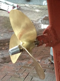 Tenminste dat dacht ik…Maar hoe vast kan zo´n schroef zitten?  De schroef is al oud (in tegenstelling tot de schroefas) en waarschijnlijk hebben we afgelopen seizoen wat hout of stenen geraakt waardoor er een paar stevige happen uit zijn genomen en ook de schroefas speling vertoond t.o.v. de koppeling. Gezien onze plannen dit seizoen staan de reparaties gelijk bovenaan onze kluslijst deze winter.