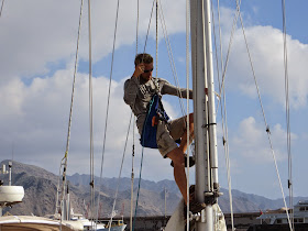 De klussenlijst. Pa en zoon hebben samen de klussenlijst onderhanden genomen. Onder toeziend oog van Jan, ging Leon de mast in om de driekleur te vervangen en de verstaging te checken. Ook een steun voor het bevestigen van de elektrische stuurautomaat op de windvaanstuurinrichting (Plan C, als plan A en B niet werken) is gemaakt en het bilge-alarm geïnstalleerd. Vruchtbaar weekje!