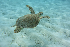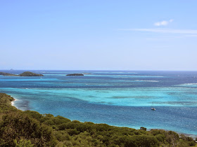 Dan wordt het weer rustiger. We gaan ankerop. Bestemming: Tobago Cays. Het is 6 mijl varen, ruim een uur. De route loopt terug langs de west- en noordkust van Mayreau. Als we langs Salt Whistle Bay varen, krijgen we de wind pal op de kop. Leon geeft een extra dot gas en stuurt Puff over de golven. Soms verdwijnt haar neus in de golf en vallen we stil. Dan zijn we het hoekje om en richten we de steven naar de Cays. 5 onbewoonde eilandjes omgeven door een groot rif in de vorm van een hoefijzer. Dit rif is de enige barrière tussen de oceaan en de eilandjes. Aan de ene kant beukt de oceaan op het rif. Aan de andere kant ligt een natuurlijke ankerbaai. De invaart tussen 2 eilanden door is vrij ondiep, een meter of drie. Terwijl het water steeds ondieper wordt, verandert de diepblauwe kleur van de oceaan in lichtere kleuren blauw. "Dáár Leon! Wat is dat? Een hoofdje? Dáár nog een! Het zijn schildpadden". Ik sta op de boeg met de camera in de aanslag. Ik weet niet waar ik moet kijken, waar ik moet klikken. Het wordt met de seconde mooier, het water een lichtere kleur blauw en het zand onder de boot witter en witter.