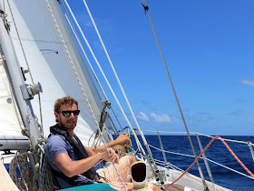 We hebben stralend blauwe luchten overdag en heldere sterrenhemels ‘s nachts. De wind is tussen de 10 en 15 knopen en de golven rond 1 meter, soms iets hoger. Echt de ideale situatie. Een bekend zeilkoppel schreef in een al even bekend boek over 'de moeder der alle weergaten'. Dat ging over de beruchte oversteek van Fiji naar New Zeeland. Nou is dat absoluut hele andere koek. Maar ook hier kan het spoken. Ik moet steeds aan die uitspraak denken. Tot nu toe hebben wij een perfect weergat te pakken. Zou het zo blijven?