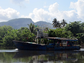 Ik sta op de boeg van Puff en zwaai uitbundig. Aan stuurboord zie ik een weg lopen, of beter gezegd een pad. Langs de waterkant staat een vader met zijn zoontje te vissen. Ze stoppen en kijken verbaasd op als ze Puff zien. Ze zwaaien naar ons en wij zwaaien enthousiast terug. "Concentratie Leon", zeg ik. Het is hier niet betond en we varen op de dieptemeter. Het moet diep genoeg zijn. Aan bakboord staan mangroven, bomen die in zout en brak water groeien. Onder de bomen wordt druk gevist. Het is al in de namiddag en dit is de tijd om te vissen. Mannen drijven rond op veelvuldig geplakte en op lappendekens lijkende opblaasbanden. Ze zitten erop en houden een vislijn in de hand. Andere hebben een klein vlot gebouwd van hout en piepschuim waar de netten op liggen. Ze zwemmen erachter aan om de netten uit te zetten. Netjes maken ze de doorvaart vrij als wij eraan komen. En iedereen zwaait even uitbundig. Hier en daar zien we ook bedrijvigheid. Verroeste silo's, een kade voor vrachtverkeer, een oude Russische hijskraan en de nodige autoriteiten. Dan zien we in de verte de stad opdoemen. Het is al tegen zessen als we de boot afmeren aan de kade van Nueva Gerona, de hoofdstad van Isla de Juventud. We liggen langszij bij de Blabber. Op z´n Hollands!